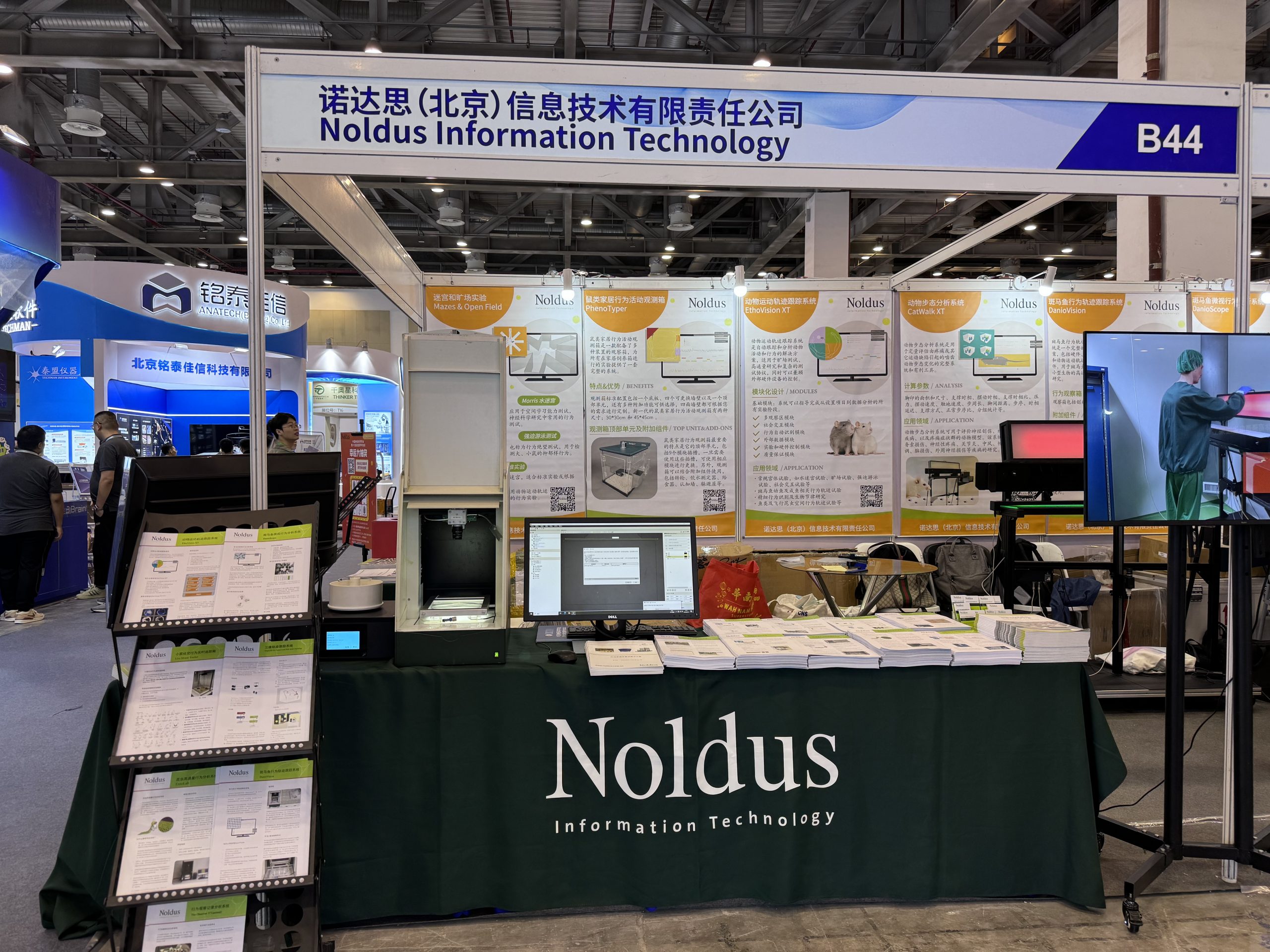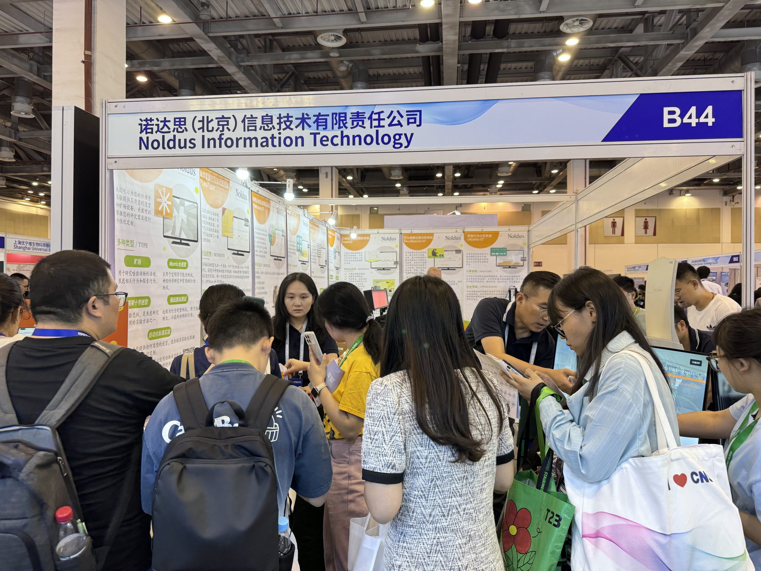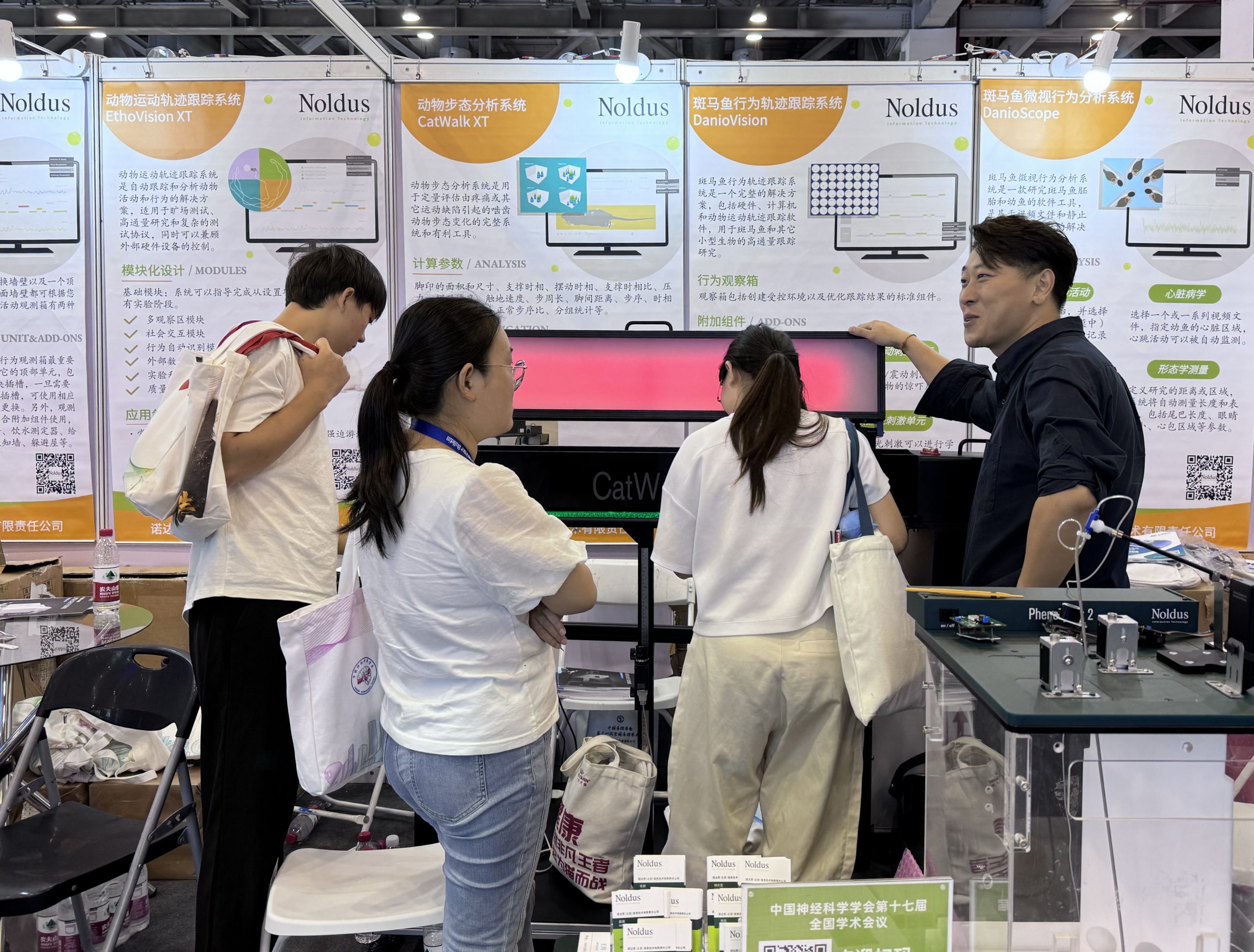 诺达思作为参展商也出席了本次大会。作为行为学研究领域的领导者,自创立以来一直致力于为全球客户提供先进的行为学研究工具和解决方案。在现场我们展示了最新研究成果和应用案例,展出的行为学研究工具包括:动物运动轨迹跟踪系统(EthoVision XT),动物步态分析系统(CatWalk XT),鼠类家居行为活动观测箱,斑马鱼行为轨迹跟踪系统(DanioVision),斑马鱼微视行为分析系统(DanioScope),鼠类家居行为活动观测箱(PhenoTyper),三维运动轨迹跟踪系统(Track3D)等。展台吸引众多嘉宾驻足参观并深入了解,相信诺达思的产品和服务会为神经科学带来重要支持,推动研究领域的进步和发展。
