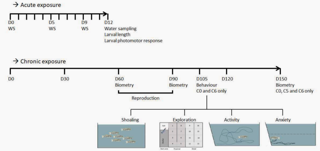 研究设计分为急性毒性实验和慢性毒性实验两部分,全面评估了污染物在不同生命阶段的影响。
