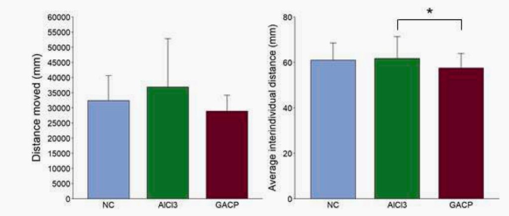焦虑水平升高:在“新型水箱测试”中,暴露于最高浓度氯化铝(AlCl₃-C6)的成鱼,在上半区停留的时间显著减少,表现出更明显的焦虑样行为(图2)。暴露于GACP最高浓度的鱼也呈现出同样的趋势(尽管未达到统计学显著水平)。