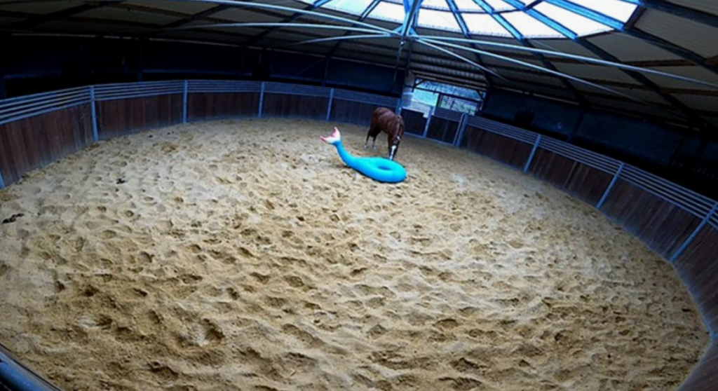 选择了两个充气泳池浮排作为测试环境中的新物体,形状为“美人鱼尾巴”和“小丑鱼”,分别用于圆形场和围场,以避免马匹因熟悉物体而产生干扰。