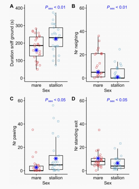 研究未发现公马和母马在与新物体直接互动(如触碰、嗅闻)方面存在显著差异。差异主要体现在一些与探索环境或应对压力相关的行为上(图3):无论在哪个测试地点,公马嗅闻地面的时间都比母马长。此外,公马也比母马更频繁地出现刨地行为,这可能与公马在自然状态下更依赖环境信息有关。母马则表现出更多的发声次数和更频繁地站在出口附近的行为。这或许反映了母马受到社会隔离的影响,更渴望回到同伴身边。此外,母马在测试中快跑的总时间也显著多于公马,显示了更高的活动性。