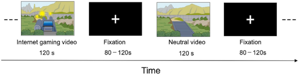 选取四段来自日本流行在线游戏的视频作为实验材料,包括益智游戏、角色扮演游戏、体育游戏和射击游戏。同时,选取了四段中性(非游戏)视频作为对照,内容涵盖旅行、卫生、家具和工作相关主题。每段视频持续120秒,通过伪随机顺序展示(图1)。