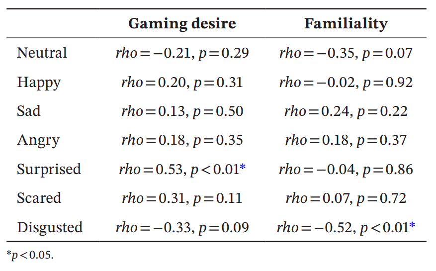 面部表情强度与游戏欲望、游戏熟悉度的相关性