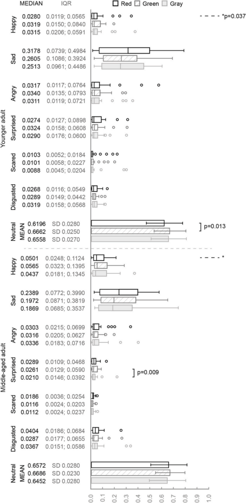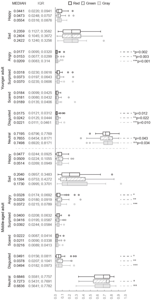 在剥蒜实验中,中年组在使用绿色剥蒜器时惊讶情绪显著高于使用灰色时。年轻组在使用红色与绿色剥蒜器时中性情绪也存在差异显著(图3)。捣土豆泥实验中,年轻组在使用灰色土豆捣碎器时中性情绪最高,而厌恶和愤怒情绪最低(图4)。